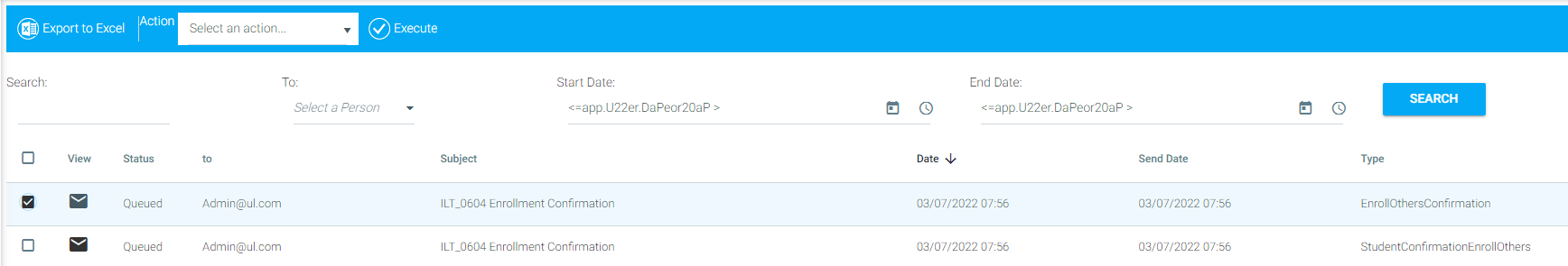 Viewing the email queue allows you to view and troubleshoot the status of email notifications. This screen also allows you to send held emails and to resend selected emails.